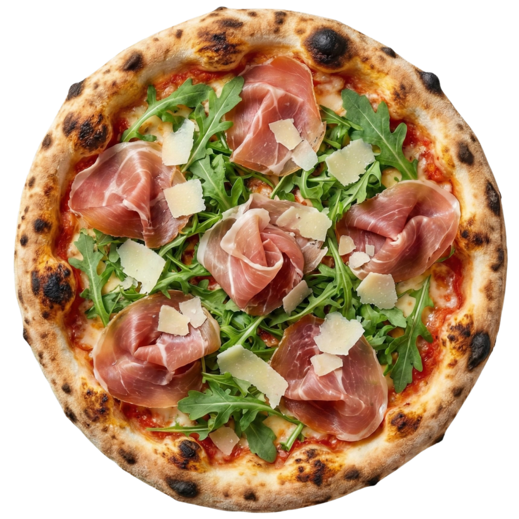 Sauce tomate, tomates fraîches, mozzarella, basilic, jambon cru ou magret fumé, copeaux de parmesan, huile d'olive