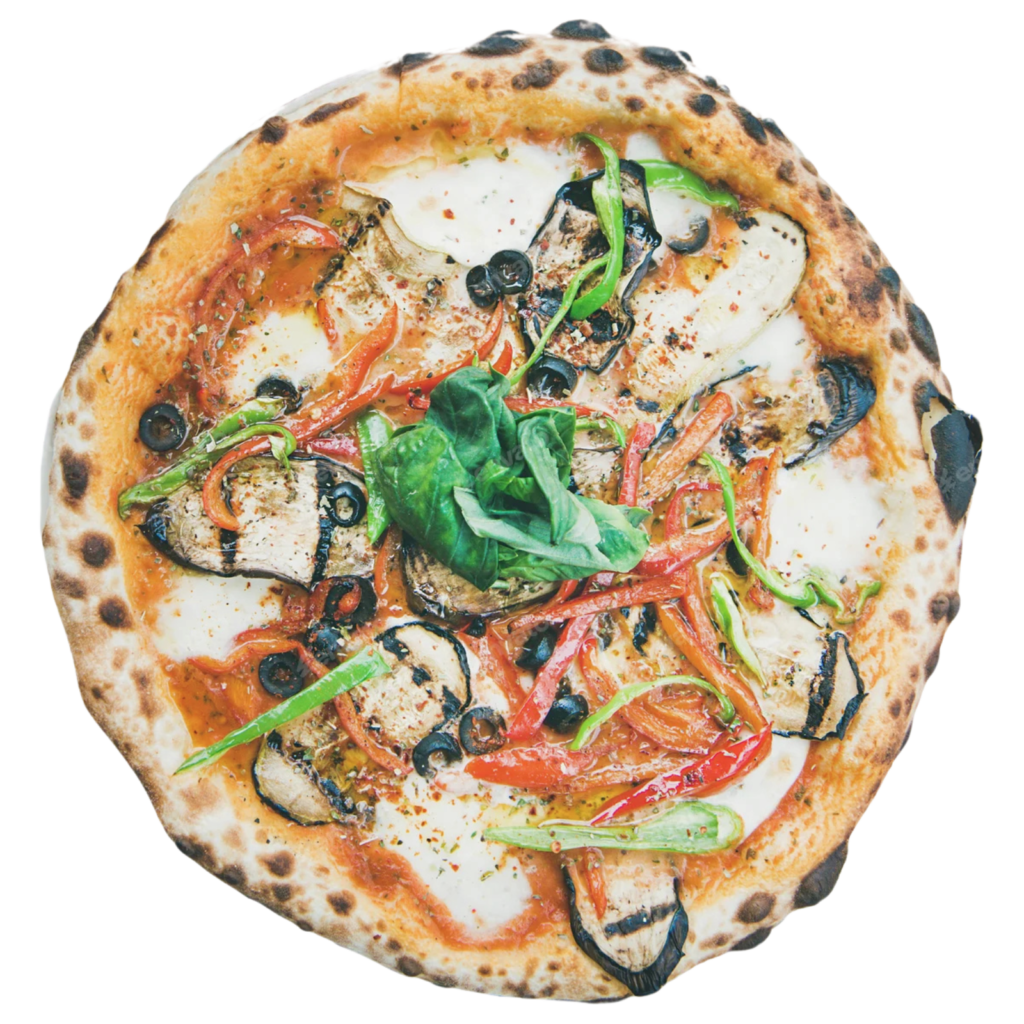 Sauce tomate, fromage, aubergines copeaux de parmesan, huile d'olive, basilic